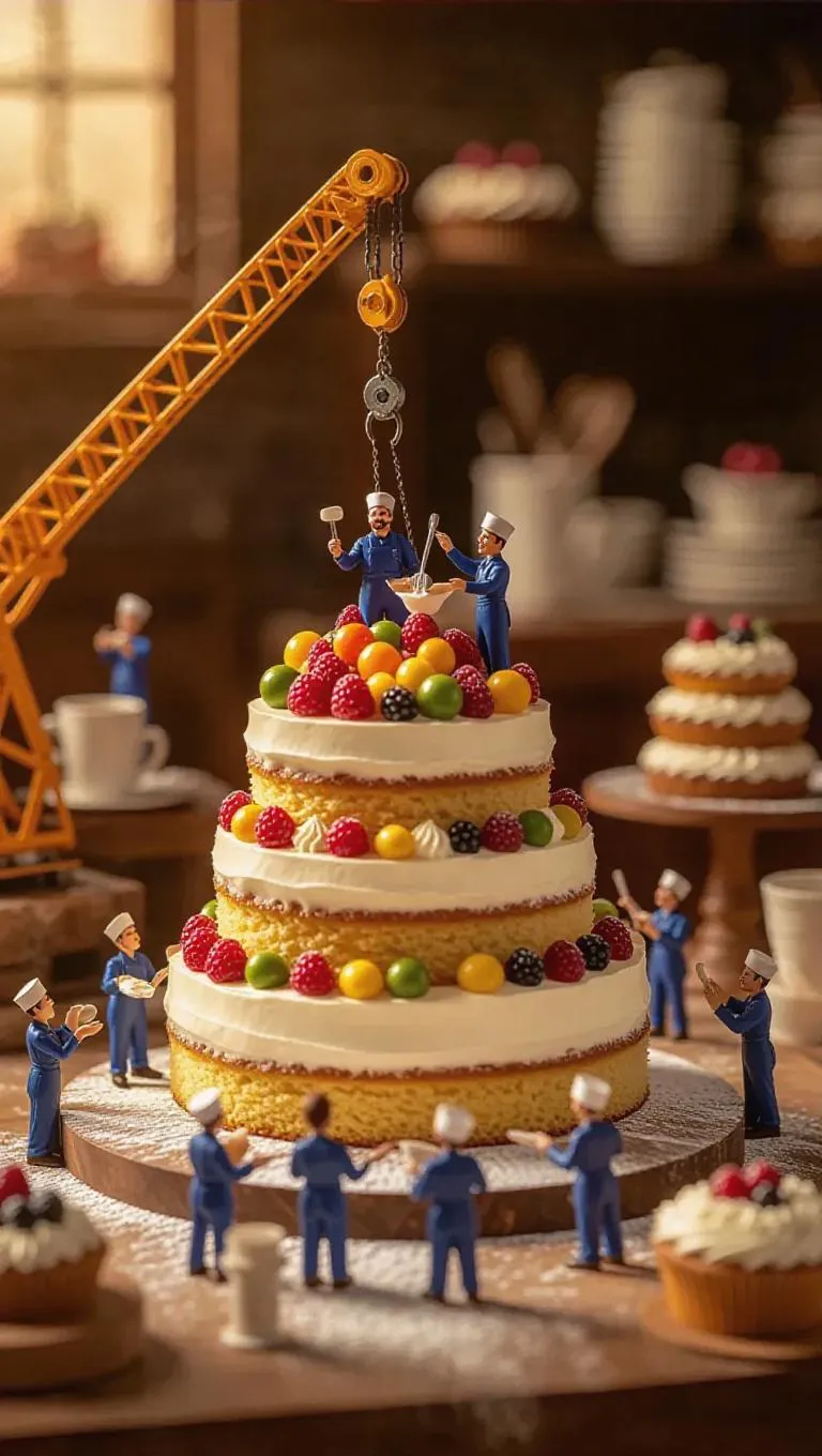 A vibrant culinary construction site where a colossal cake is being assembled by thumb-sized workers. A tiny crane carefully lifts a fresh layer of sponge, while small bakers spread frosting with mini spatulas. Some workers arrange fruits and decorations like jewels, while others carefully stack the cake layers. Warm light fills the scene, highlighting the sweetness of the ingredients, while the blurred background reveals a charming bakery with pastries and coffee.