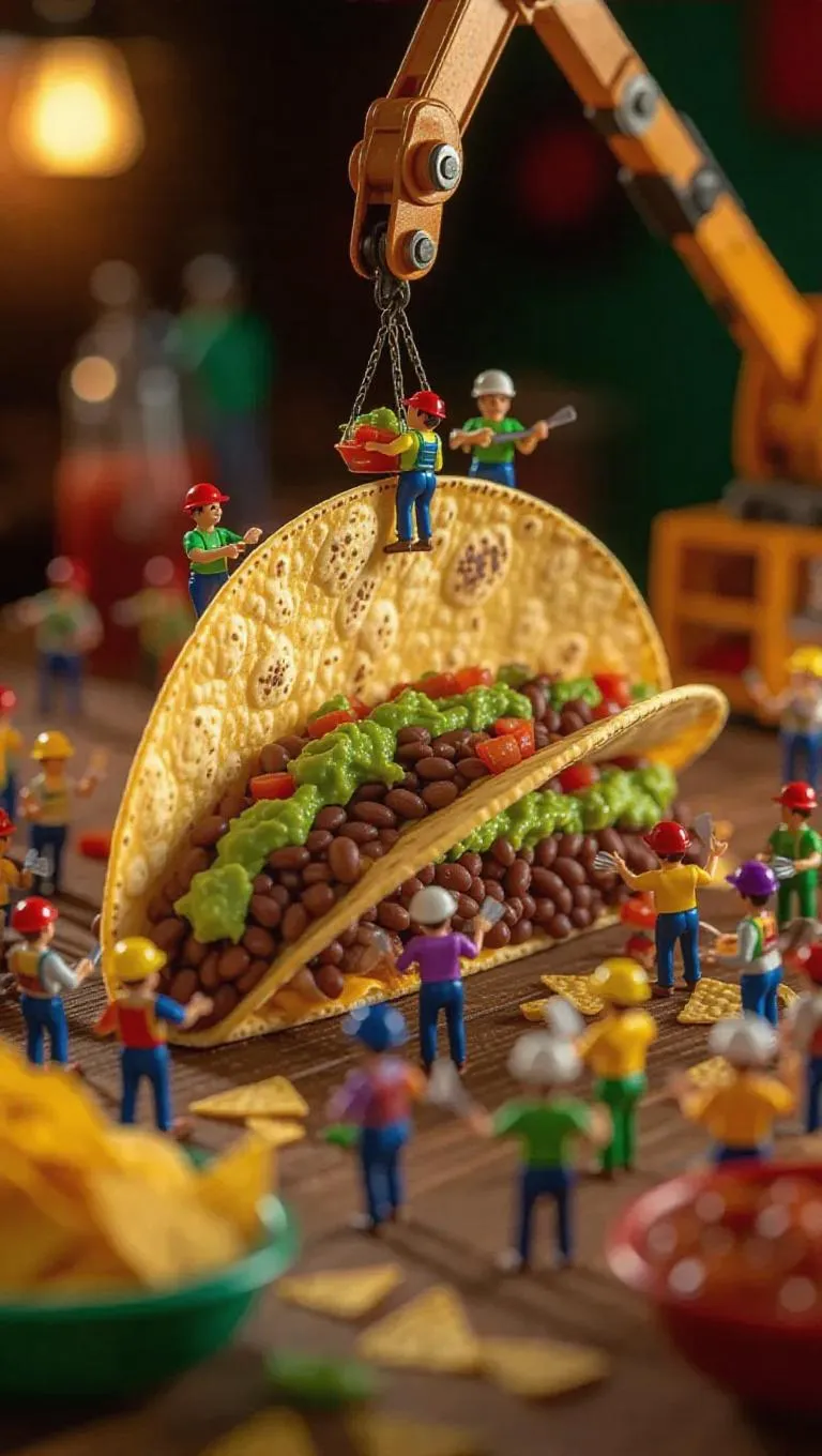An adventurous culinary construction site where a gigantic taco is being assembled by thumb-sized workers. A small crane carefully lifts a fresh tortilla, while tiny chefs spread guacamole with little spatulas. Some workers arrange layers of beans and cheese like jewels, while others carefully fold the taco with tiny hands. Bright colors fill the scene, hinting at the zest of the ingredients, while the blurred background reveals a lively Mexican cantina with salsa and chips.