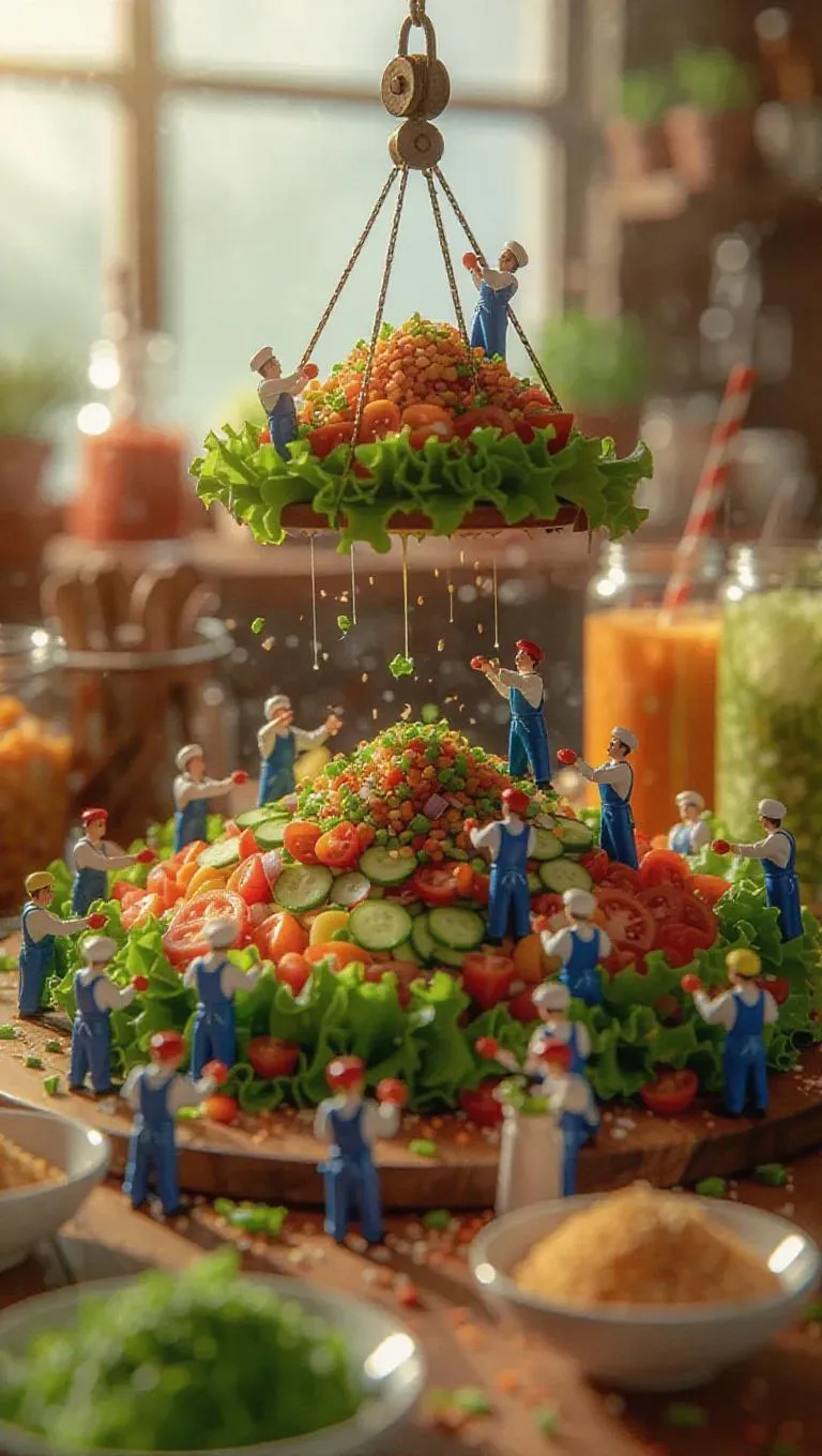 An enchanting culinary construction site where a colossal salad is being assembled by thumb-sized workers. A tiny crane carefully lifts fresh greens, while small chefs sprinkle dressing with mini bottles. Some workers arrange slices of vegetables like jewels, while others carefully toss the salad with tiny bowls. Bright colors burst forth, reflecting the freshness of the ingredients, while the blurred background reveals a sunny cafe with smoothies and wraps nearby.