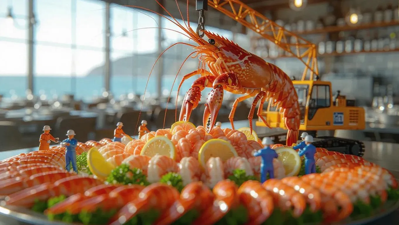 An imaginative culinary construction site where a massive seafood platter is being assembled by thumb-sized workers. A miniature crane carefully lifts a giant shrimp, while tiny chefs arrange lemon slices with little hands. Some workers layer crab and lobster like jewels, while others carefully garnish with herbs. Soft light reflects off the seafood, enhancing the freshness of the ingredients, while the blurred background reveals a coastal restaurant with ocean views and cocktails.