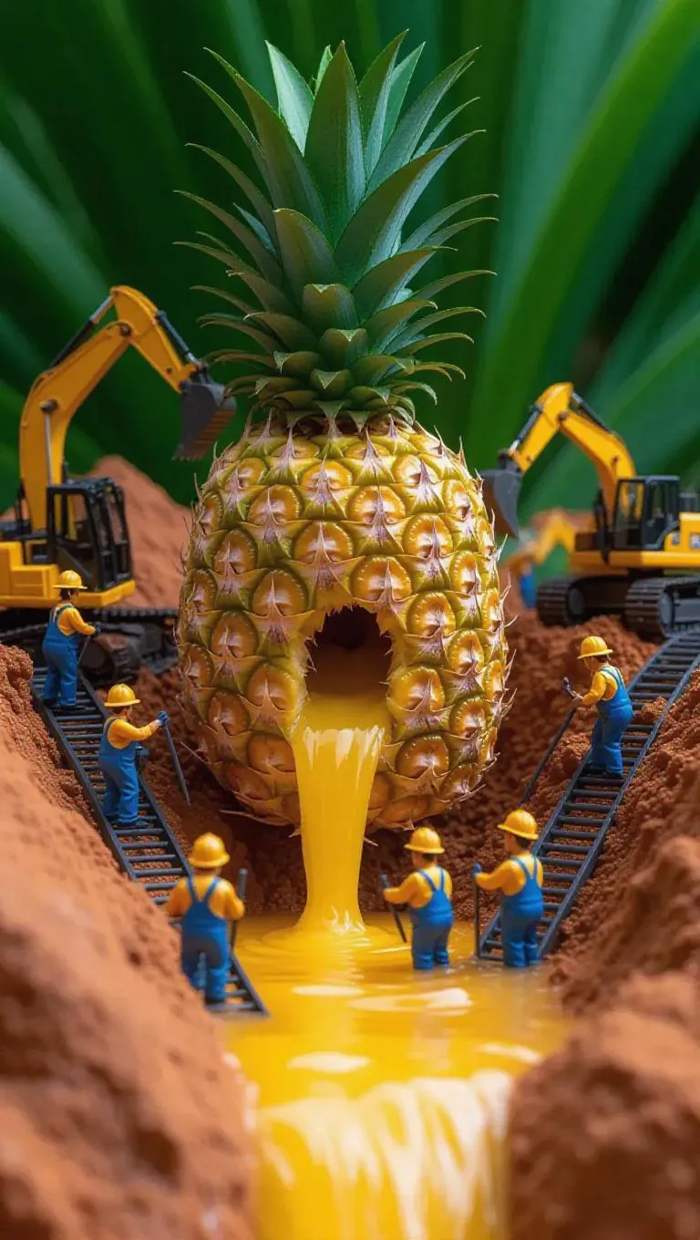 A surreal scene of tiny workers mining a massive pineapple as if it were a rock quarry. Excavators and pickaxes carve into the spiky yellow flesh, while conveyor belts transport tiny seeds like giant boulders. Pineapple juice flows down like a refreshing waterfall, creating a stunning contrast against the green leafy top. The workers wear tropical-patterned hard hats and overalls, adding a playful touch to the scene.