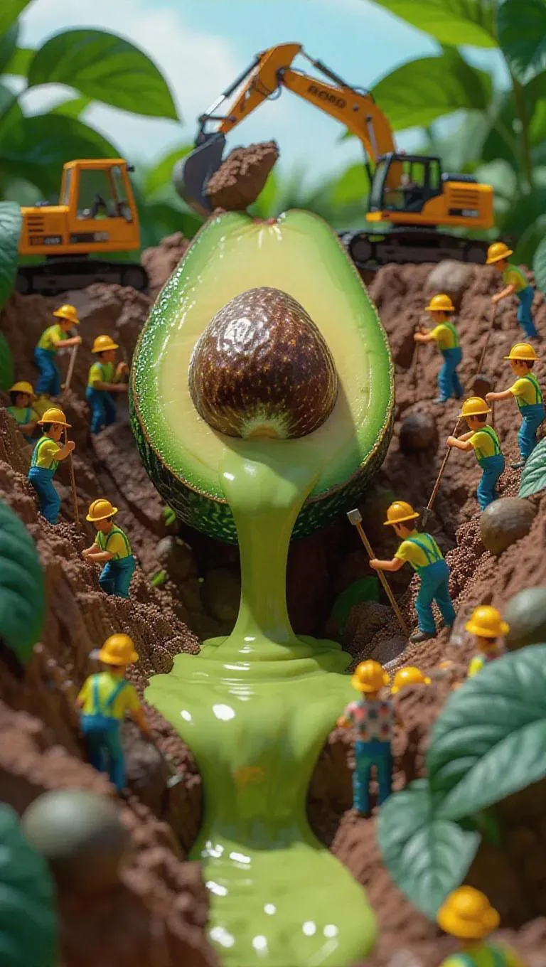 A surreal scene of tiny workers mining a massive avocado as if it were a rock quarry. Excavators and pickaxes carve into the creamy green flesh, while conveyor belts transport tiny seeds like giant boulders. Avocado juice flows down like a refreshing waterfall, creating a stunning contrast against the green leafy top. The workers wear fruity hard hats and checkered overalls, adding a playful touch to the scene.