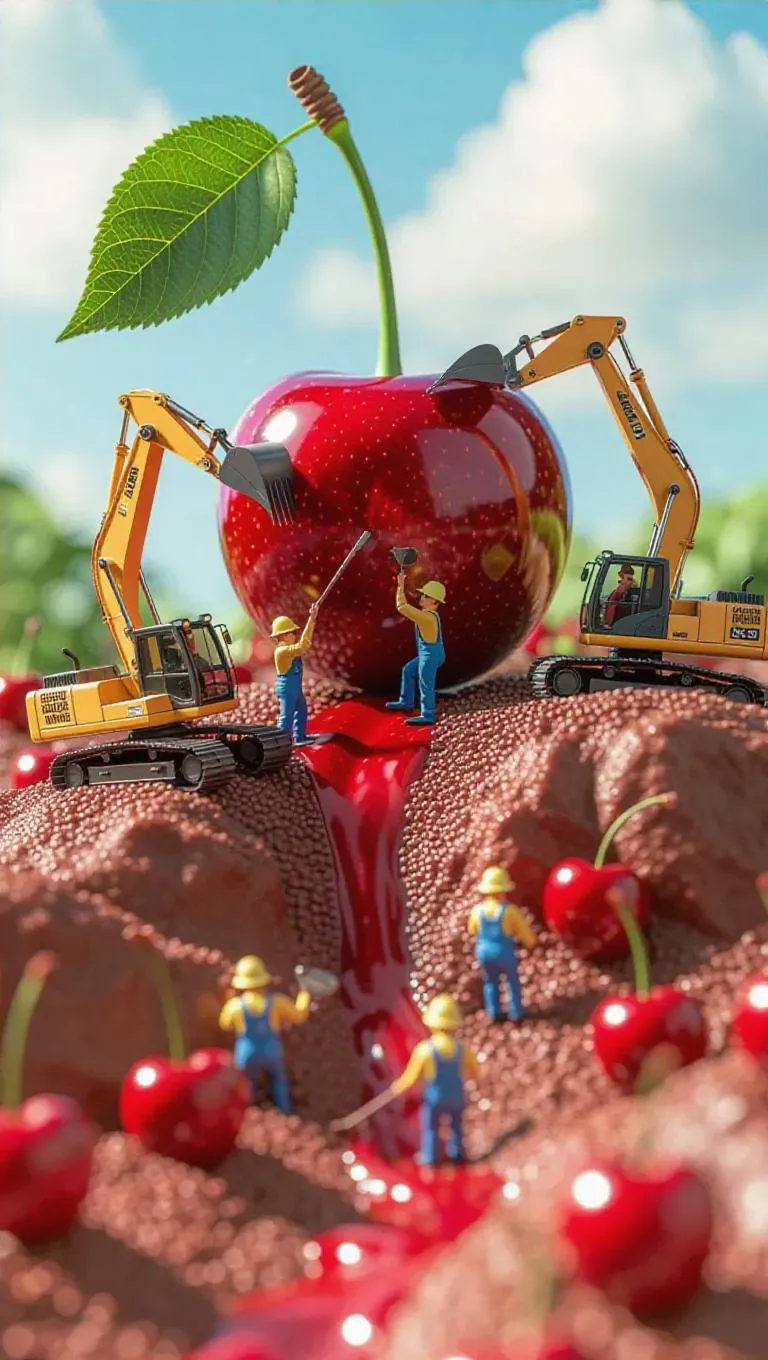 A surreal scene of tiny workers mining a massive cherry as if it were a rock quarry. Excavators and pickaxes carve into the shiny red flesh, while conveyor belts transport tiny seeds like giant boulders. Cherry juice flows down like a refreshing waterfall, creating a stunning contrast against the green leafy top. The workers wear whimsical hard hats and colorful overalls, adding a playful touch to the scene.