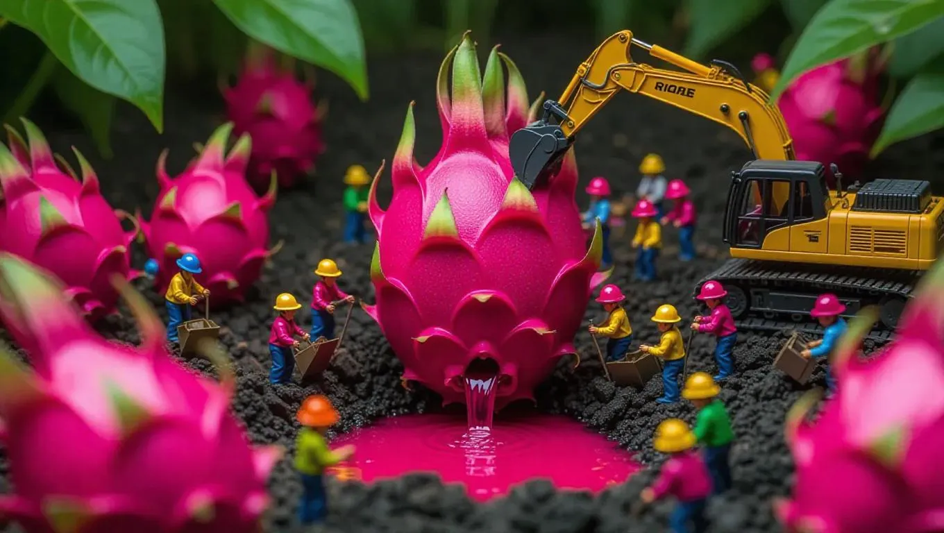A surreal scene of tiny workers mining a massive dragon fruit as if it were a rock quarry. Excavators and pickaxes carve into the vibrant pink flesh, while conveyor belts transport tiny seeds like giant boulders. Dragon fruit juice flows down like a refreshing waterfall, creating a stunning contrast against the green leafy top. The workers wear exotic patterned hard hats and colorful overalls, adding a playful touch to the scene.