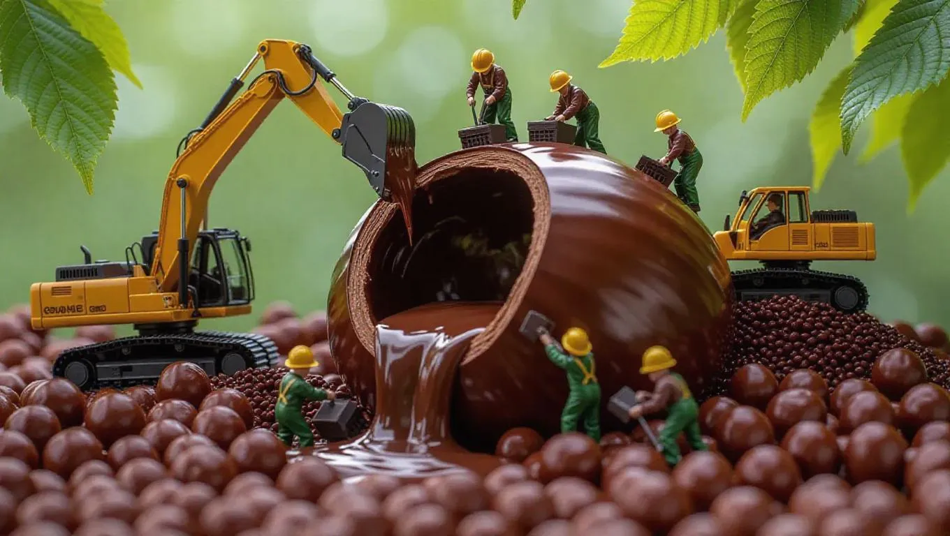 A surreal scene of tiny workers mining a massive chestnut as if it were a rock quarry. Excavators and pickaxes carve into the shiny brown shell, while conveyor belts transport tiny seeds like giant boulders. Chestnut puree flows down like a refreshing waterfall, creating a stunning contrast against the green leafy top. The workers wear woodland-inspired hard hats and chocolate-colored overalls, adding a playful touch to the scene.