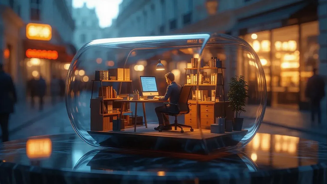A highly detailed miniature office setup inside a transparent plastic cylinder, featuring a fully furnished workspace with a glass desk, computer, chair, office supplies, and tiny bookshelves. A small human figure is writing furiously at the desk. Bright, warm interior lighting creates a focused atmosphere. The cylinder rests on a sleek, marble surface with a reflective quality, set against a sophisticated urban background with cafes and shops. Rendered in a sleek 3D style with ultra-modern textures. The office is designed in a chic city style with modern materials and elegant design, set in a lively downtown area with people enjoying their day.