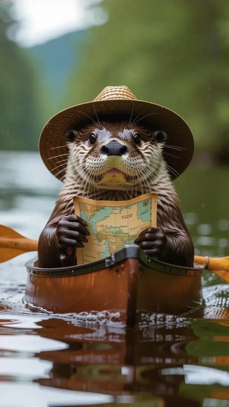 An adventurous otter paddles a canoe down a winding river, holding a map in one paw. The otter wears a wide-brimmed