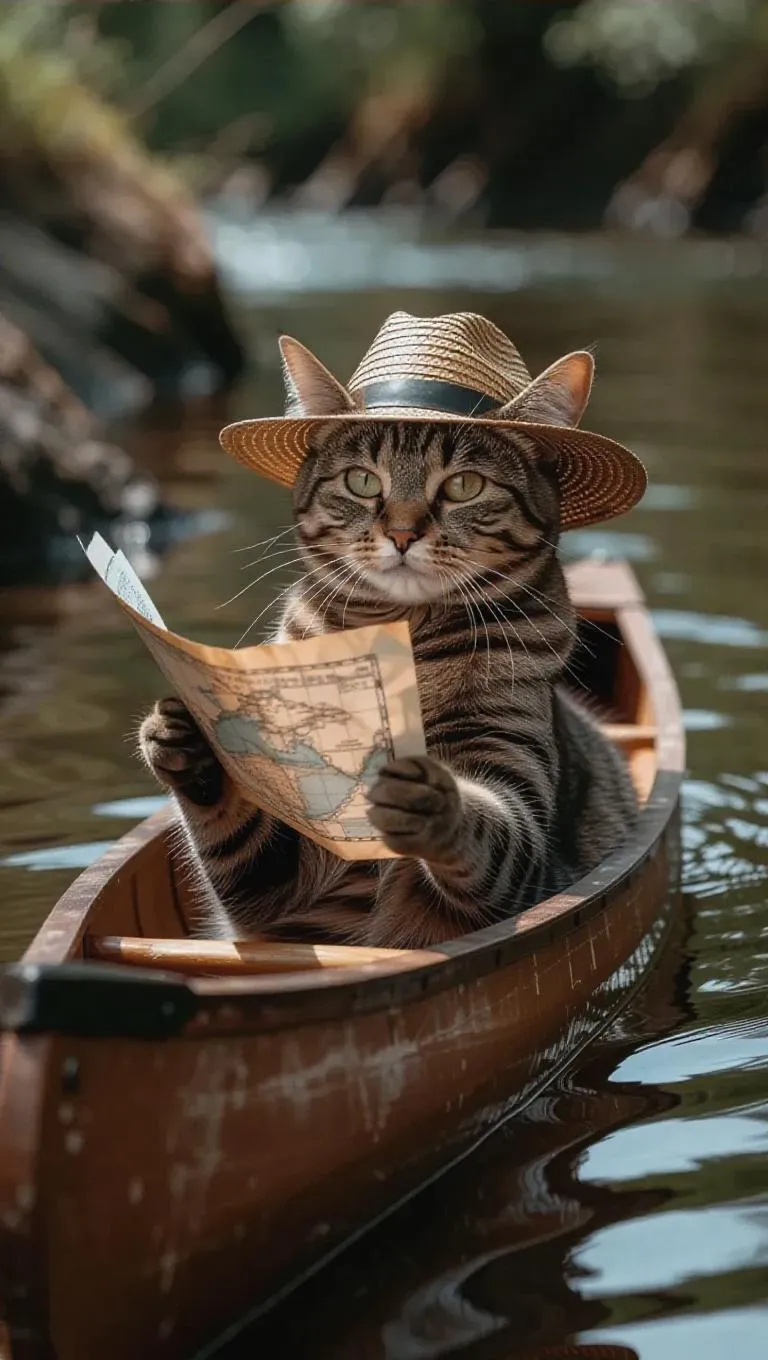 A determined cat paddles a canoe down a winding river, holding a map in one paw. The cat wears a wide-brimmed