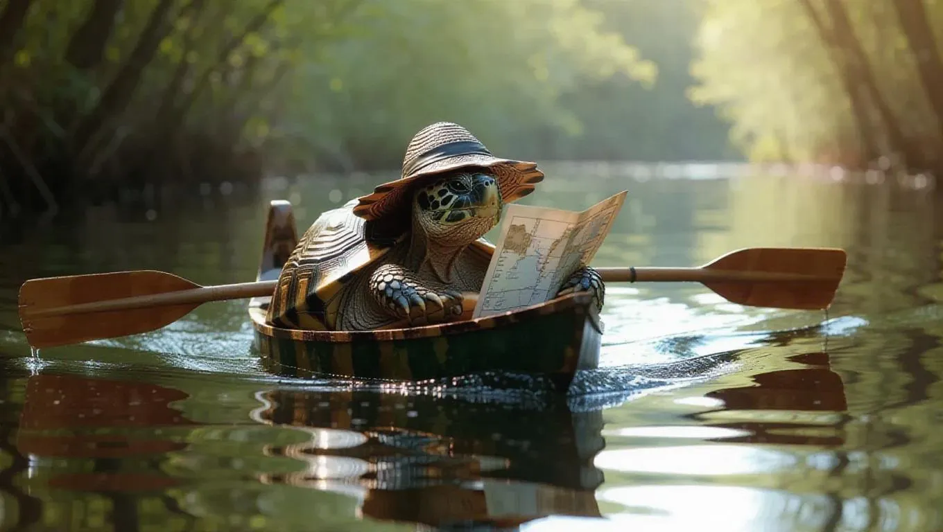 A gentle tortoise paddles a canoe down a winding river, holding a map in one paw. The tortoise wears a wide-brimmed