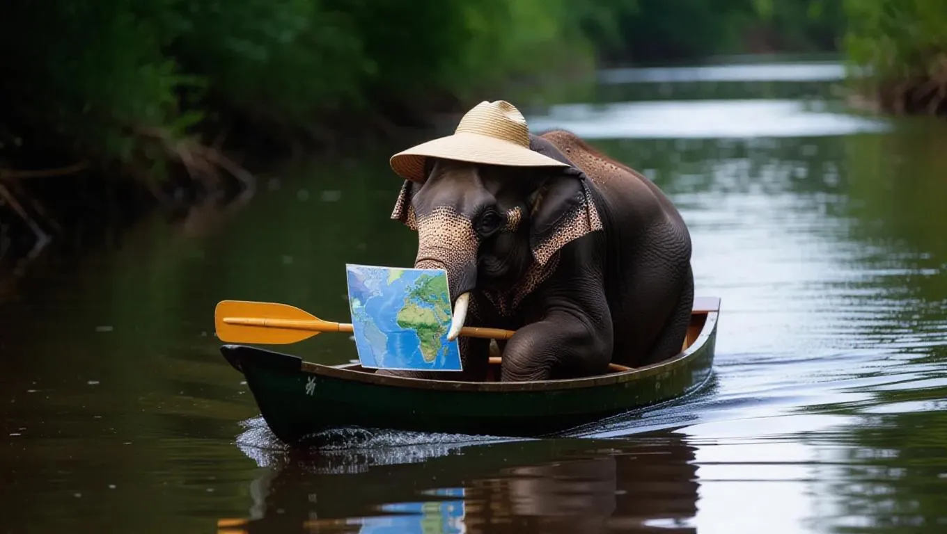 A steadfast elephant paddles a canoe down a winding river, holding a map in one paw. The elephant wears a wide-brimmed