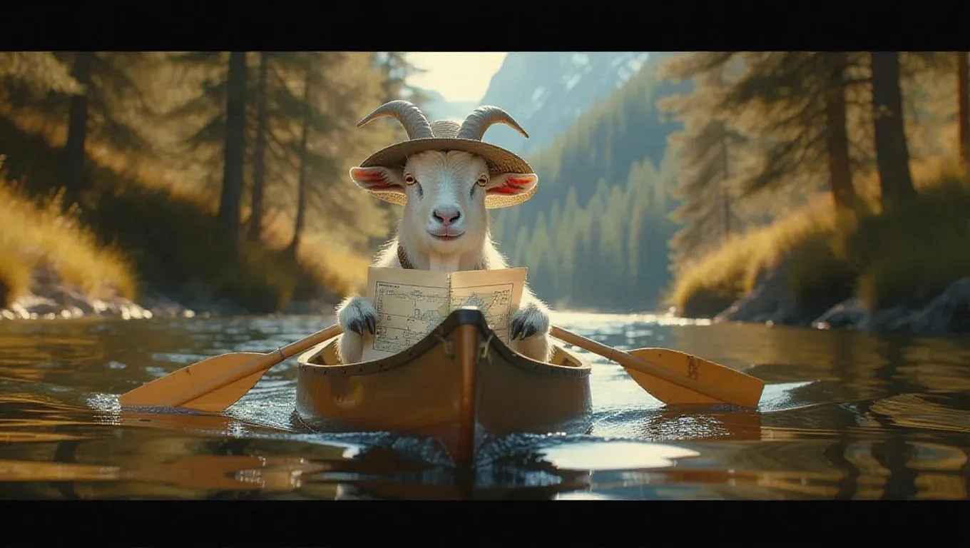 A spirited goat paddles a canoe down a winding river, holding a map in one paw. The goat wears a wide-brimmed