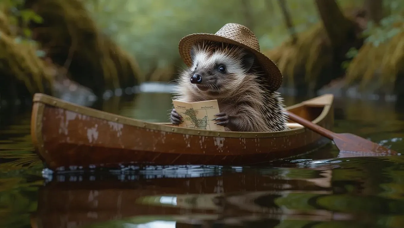 A resourceful hedgehog paddles a canoe down a winding river, holding a map in one paw. The hedgehog wears a wide-brimmed
