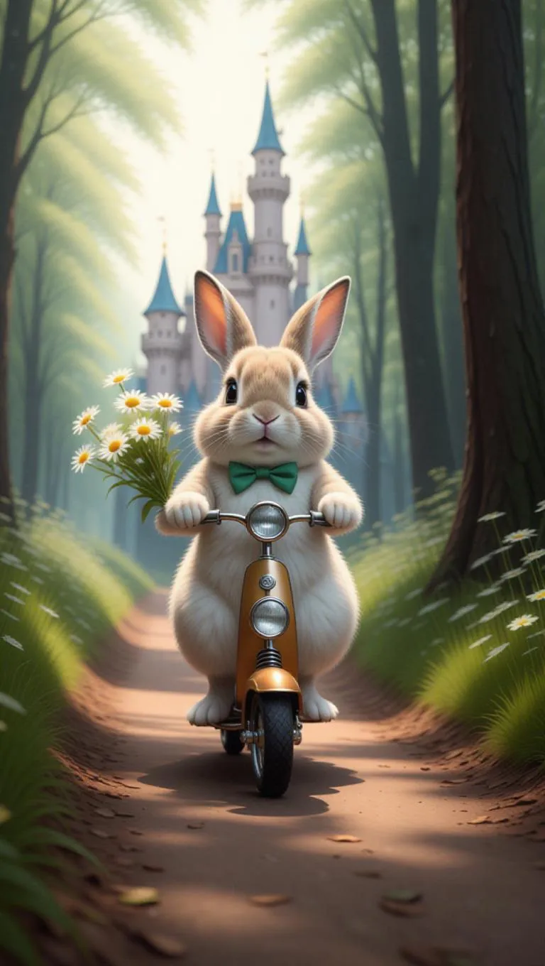A charming rabbit hops energetically along a dirt path, riding a small scooter. The rabbit, with its fluffy white fur and a green bow tie, holds a bouquet of daisies in its front paws. The path is framed by tall trees that provide a cool shade. In the background, a beautiful castle stands proudly, enhancing the fairy-tale atmosphere, with a light fog enveloping the environment.