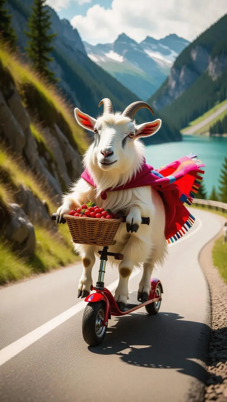 A spirited goat gallops playfully on a scooter, speeding along a winding mountain road. The goat, with its fluffy white coat and a colorful cape fluttering behind, carries a basket of fresh berries in its mouth. The road is surrounded by lush greenery and rocky cliffs. In the distance, a serene lake sparkles in the sunlight, enhancing the sense of adventure, with a breeze rustling the leaves.