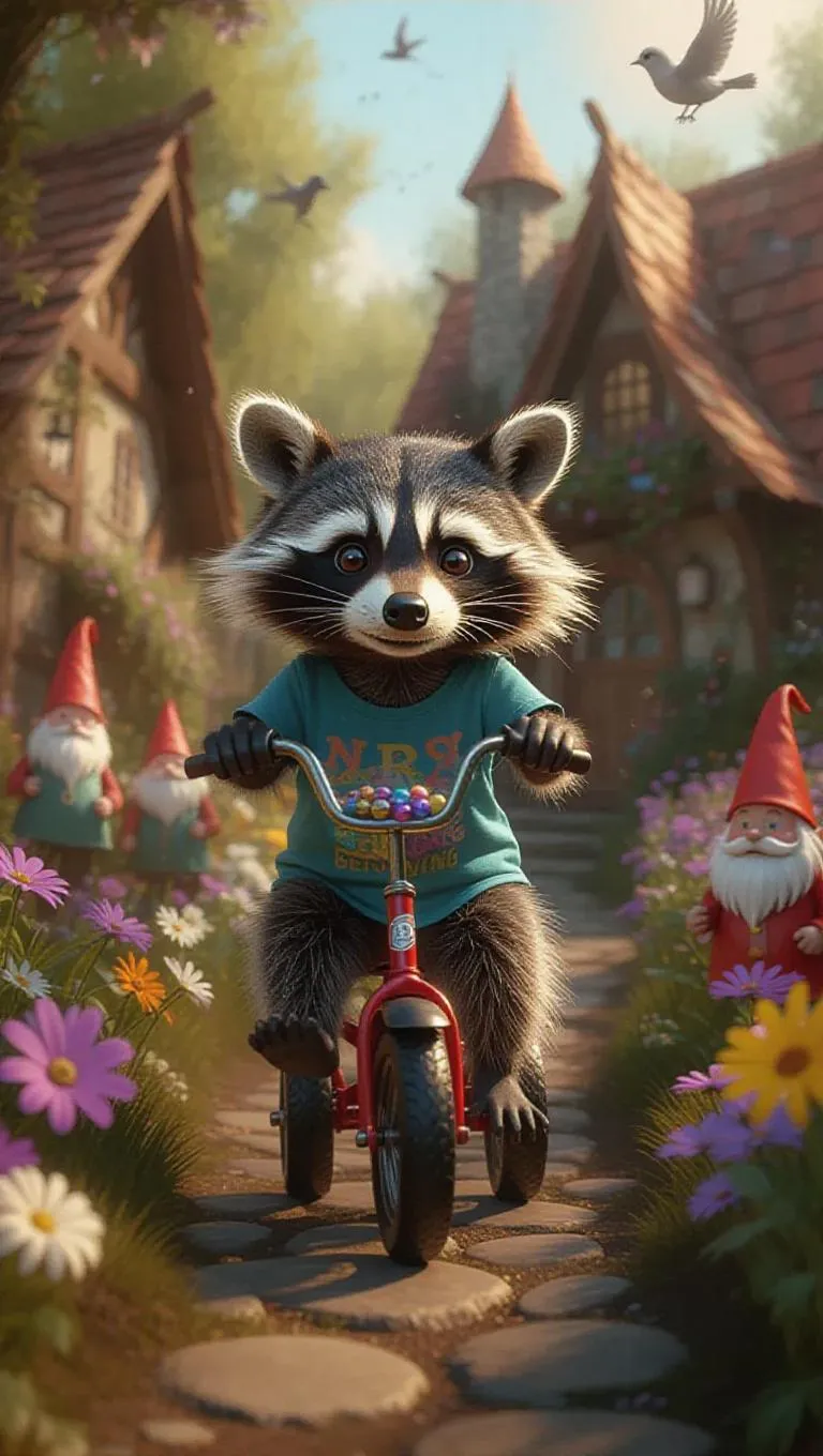 A mischievous raccoon clumsily rides a tricycle, moving along a whimsical garden path. The raccoon, with its masked face and a colorful t-shirt, holds a handful of glittering marbles in its paws. The garden is bursting with blooming flowers and playful gnomes. In the distance, a quaint cottage peeks through the foliage, adding to the enchantment of the scene, with birds chirping cheerfully.