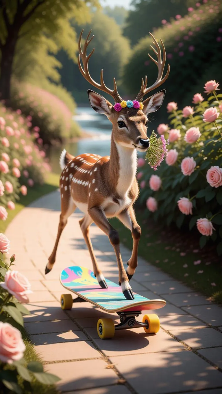 A whimsical deer prances gracefully on a colorful skateboard, gliding down a sun-drenched pathway. The deer, with its elegant antlers and a flower crown, carries a small bouquet of wildflowers in its mouth. The pathway is lined with vibrant blooming roses. In the background, a picturesque river flows gently, enhancing the serene atmosphere, with a warm breeze brushing by.