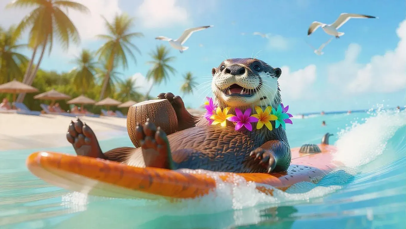 A joyful otter tumbles playfully on a surfboard, riding the waves at a sunny beach. The otter, with sleek fur and a flower lei around its neck, holds a coconut drink with its paws. The beach is filled with sunbathers enjoying the summer day. In the background, palm trees sway gently, adding a tropical vibe, with seagulls soaring above.