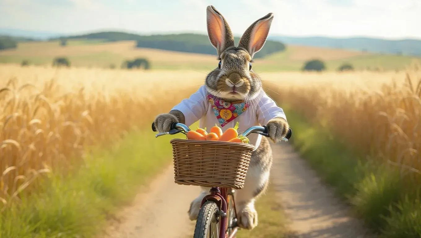 A lively rabbit races swiftly on a bicycle, speeding down a countryside lane. The rabbit, sporting fluffy ears and a colorful bandana, has a basket of carrots in its front. The lane is flanked by golden fields of wheat. In the background, rolling hills stretch into the horizon, enhancing the feeling of freedom, with a gentle breeze whispering through the grass.