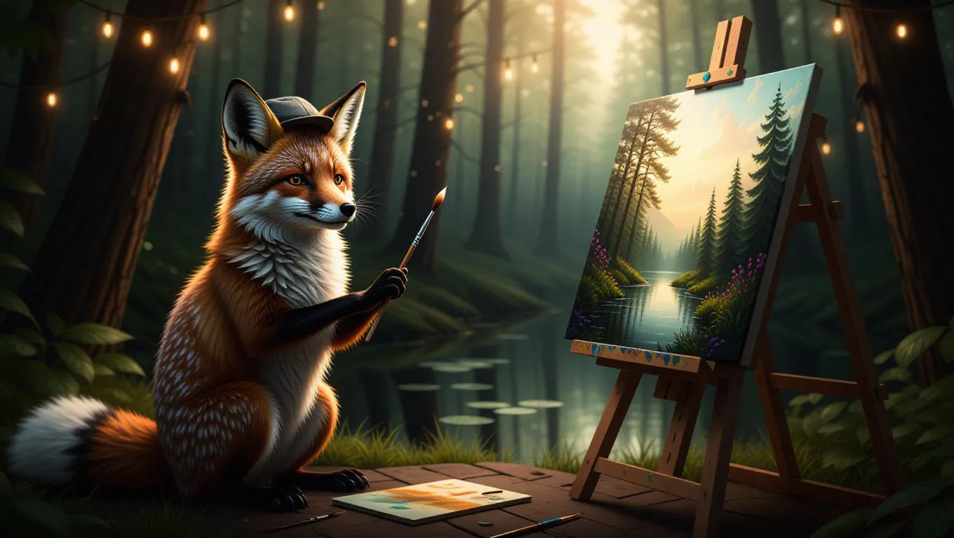 An artistic fox paints vividly on a canvas set up in an enchanted forest. The fox, with its vibrant fur and a beret, holds a brush with its paw. The forest is filled with magical lights that illuminate the trees. In the distance, a serene pond reflects the beauty of nature, adding a sense of peace, with soft melodies of nature playing in the background.