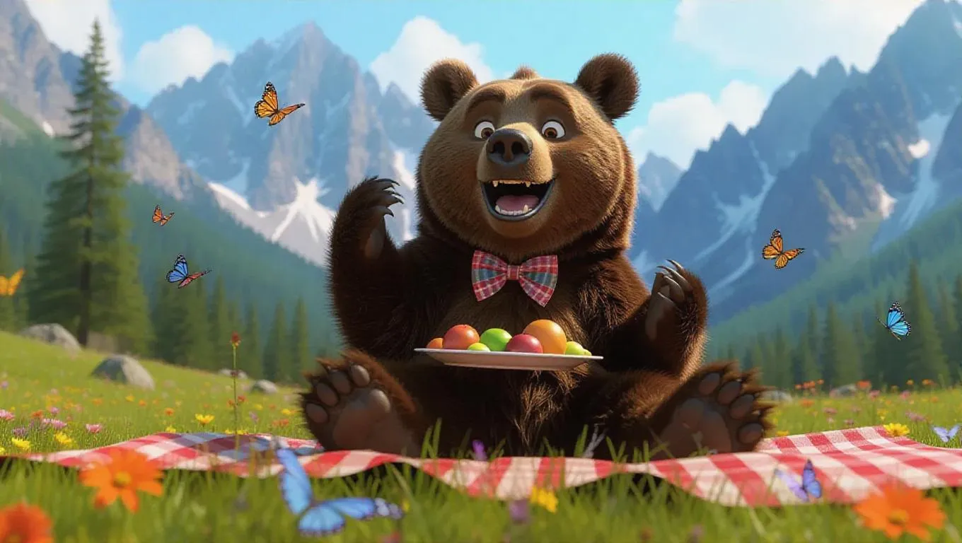 A jubilant bear dances playfully on a picnic blanket in a sunny meadow. The bear, with its fuzzy coat and a cheerful bow tie, holds a plate of fruits in its paws. The meadow is dotted with colorful flowers and playful butterflies. In the backdrop, tall mountains loom majestically, adding a charming landscape, with laughter echoing among friends.