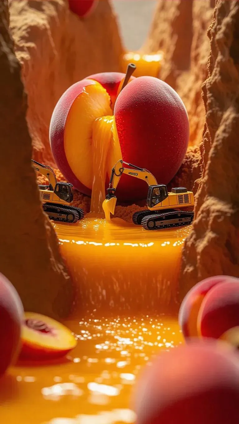 A surreal scene of tiny workers mining a massive peach as if it were a rock quarry. Excavators and pickaxes carve into the soft flesh, while conveyor belts transport peach pits like giant boulders. Peach juice flows down like a refreshing waterfall, creating a stunning contrast against the fuzzy skin. The scene is enhanced by the sound of the juice splashing into a pool of peach nectar below.