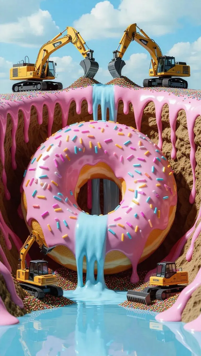 A surreal scene of tiny workers mining a massive donut as if it were a rock quarry. Excavators and pickaxes carve into the fluffy dough, while conveyor belts transport sprinkles like giant boulders. Icing flows down like a refreshing waterfall, creating a stunning contrast against the glazed surface. The scene is enhanced by the sound of the icing splashing into a pool of sweet syrup below.