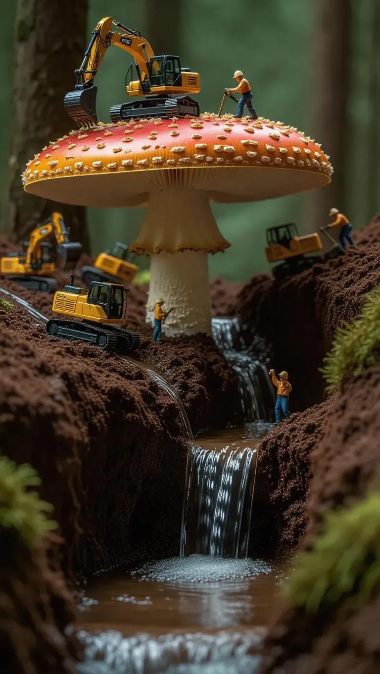 A surreal scene of tiny workers mining a massive mushroom as if it were a rock quarry. Excavators and pickaxes carve into the spongy cap, while conveyor belts transport mushroom stems like giant boulders. Mushroom juice flows down like a refreshing waterfall, creating a stunning contrast against the earthy gills. The scene is enhanced by the sound of the juice splashing into a pool of rich soil below.