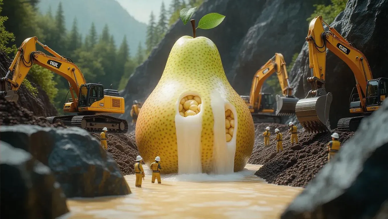 A surreal scene of tiny workers mining a massive pear as if it were a rock quarry. Excavators and pickaxes carve into the soft flesh, while conveyor belts transport pear seeds like giant boulders. Pear juice flows down like a refreshing waterfall, creating a stunning contrast against the smooth skin. The scene is enhanced by the sound of the juice splashing into a pool of pear essence below.