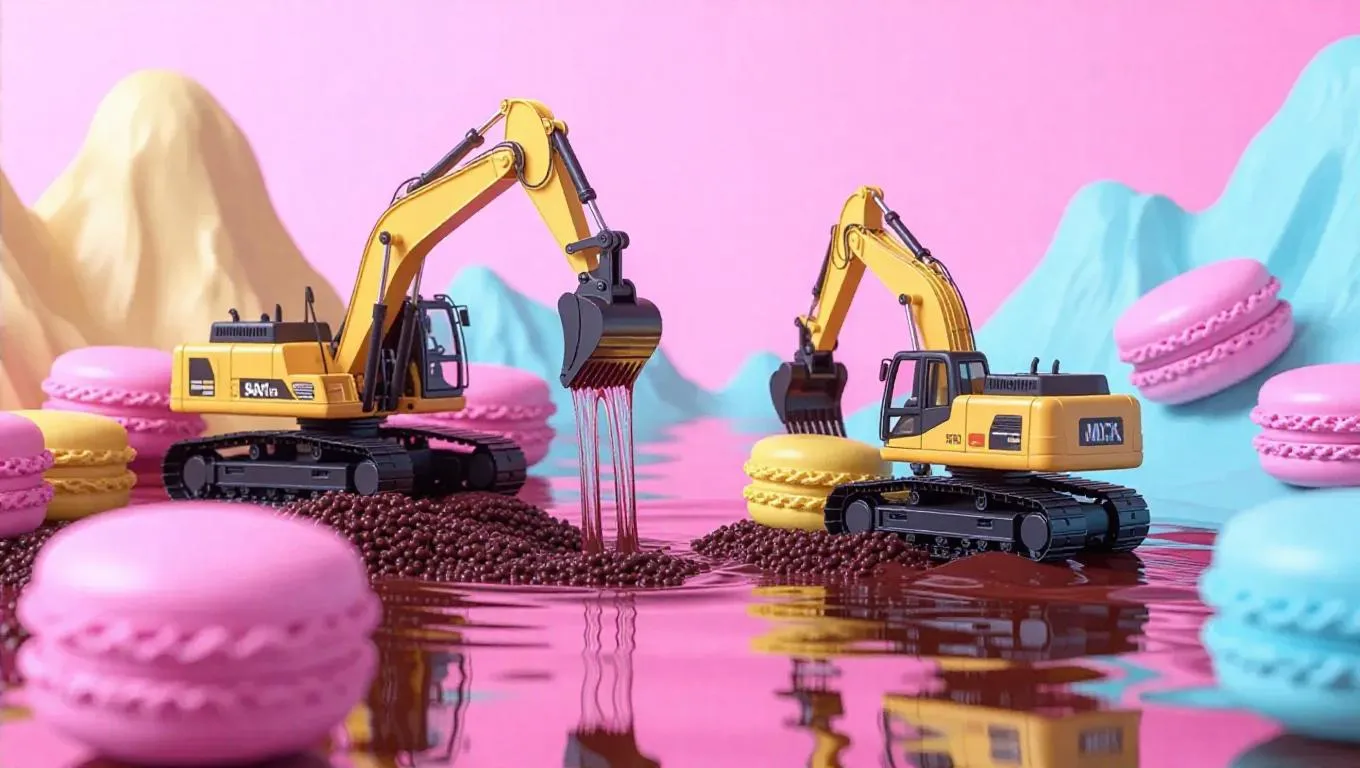 A surreal scene of tiny workers mining a massive macaron as if it were a rock quarry. Excavators and pickaxes carve into the delicate shell, while conveyor belts transport cream filling like giant boulders. Ganache flows down like a refreshing waterfall, creating a stunning contrast against the pastel shells. The scene is enhanced by the sound of the ganache splashing into a pool of sweet chocolate below.