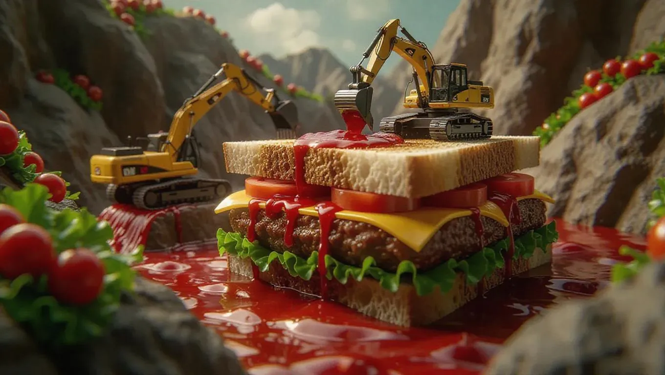 A surreal scene of tiny workers mining a massive sandwich as if it were a rock quarry. Excavators and pickaxes carve into the layers of bread, while conveyor belts transport lettuce and tomatoes like giant boulders. Sauce flows down like a refreshing waterfall, creating a stunning contrast against the sandwich's ingredients. The scene is enhanced by the sound of the sauce splashing into a pool of savory goodness below.