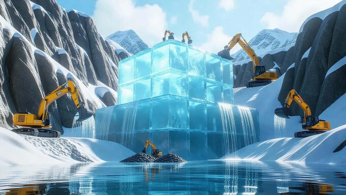 A surreal scene of tiny workers mining a massive ice cube as if it were a rock quarry. Excavators and pickaxes carve into the clear ice, while conveyor belts transport ice shards like giant boulders. Melted water flows down like a refreshing waterfall, creating a stunning contrast against the solid blocks. The scene is enhanced by the sound of the water splashing into a pool of purity below.
