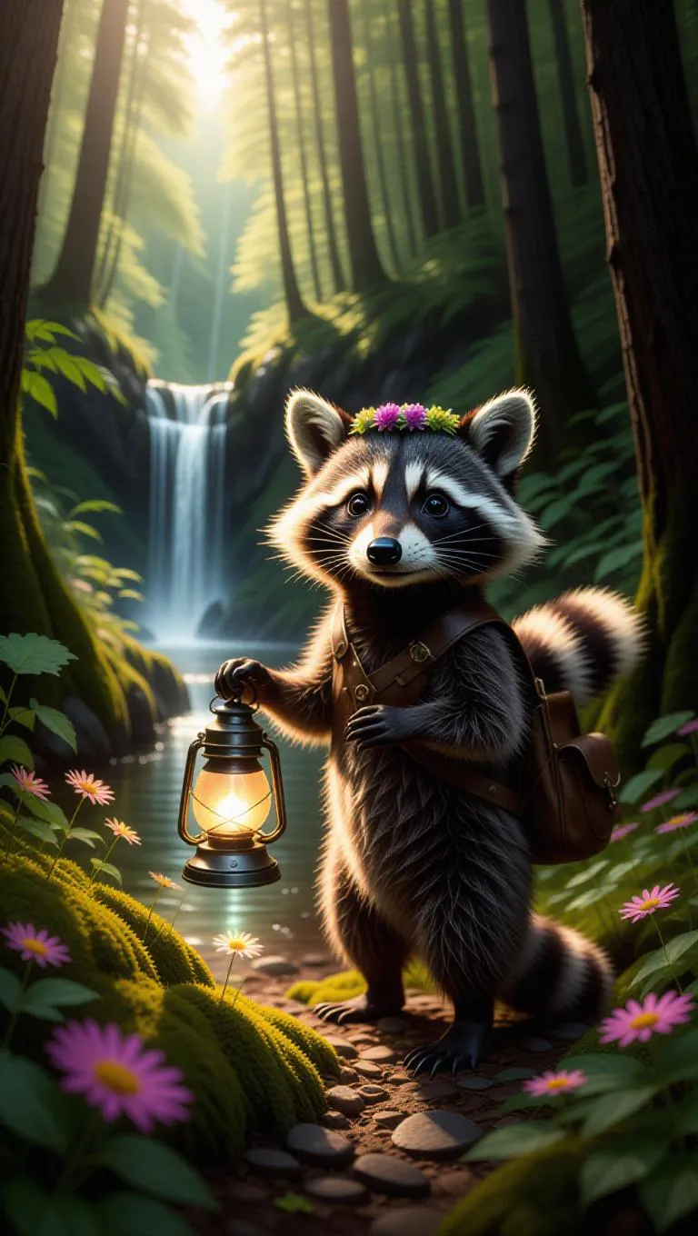 A curious raccoon stands at the edge of a bright forest, holding a glowing lantern in its paw. The raccoon wears a brown satchel and a flower crown. Behind it, tall trees stretch into the sky, their leaves glistening in the bright sunlight. In the distance, a hidden waterfall splashes into a sparkling pool, its mist creating a prism in the sunlight. The forest floor is covered in vibrant moss and wildflowers, adding a touch of magic to the scene.