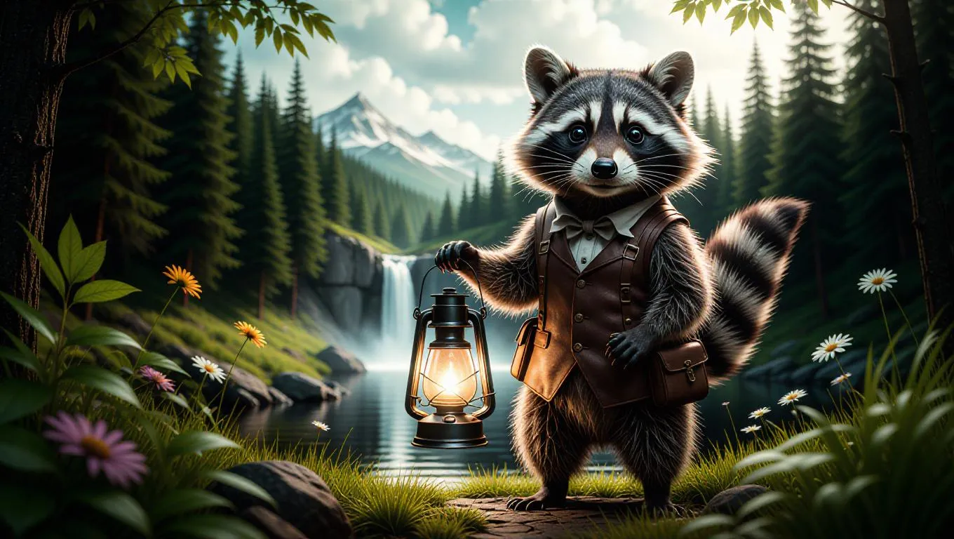 A curious raccoon stands at the edge of a lush forest, holding a glowing lantern in one paw. The raccoon wears a brown satchel and a waistcoat. Behind it, tall trees stretch into the cloudy sky, their leaves swaying gently in the breeze. In the distance, a hidden waterfall splashes into a clear pool, its mist creating droplets of light. The forest floor is covered in lush grass and wildflowers, adding a touch of life to the scene.
