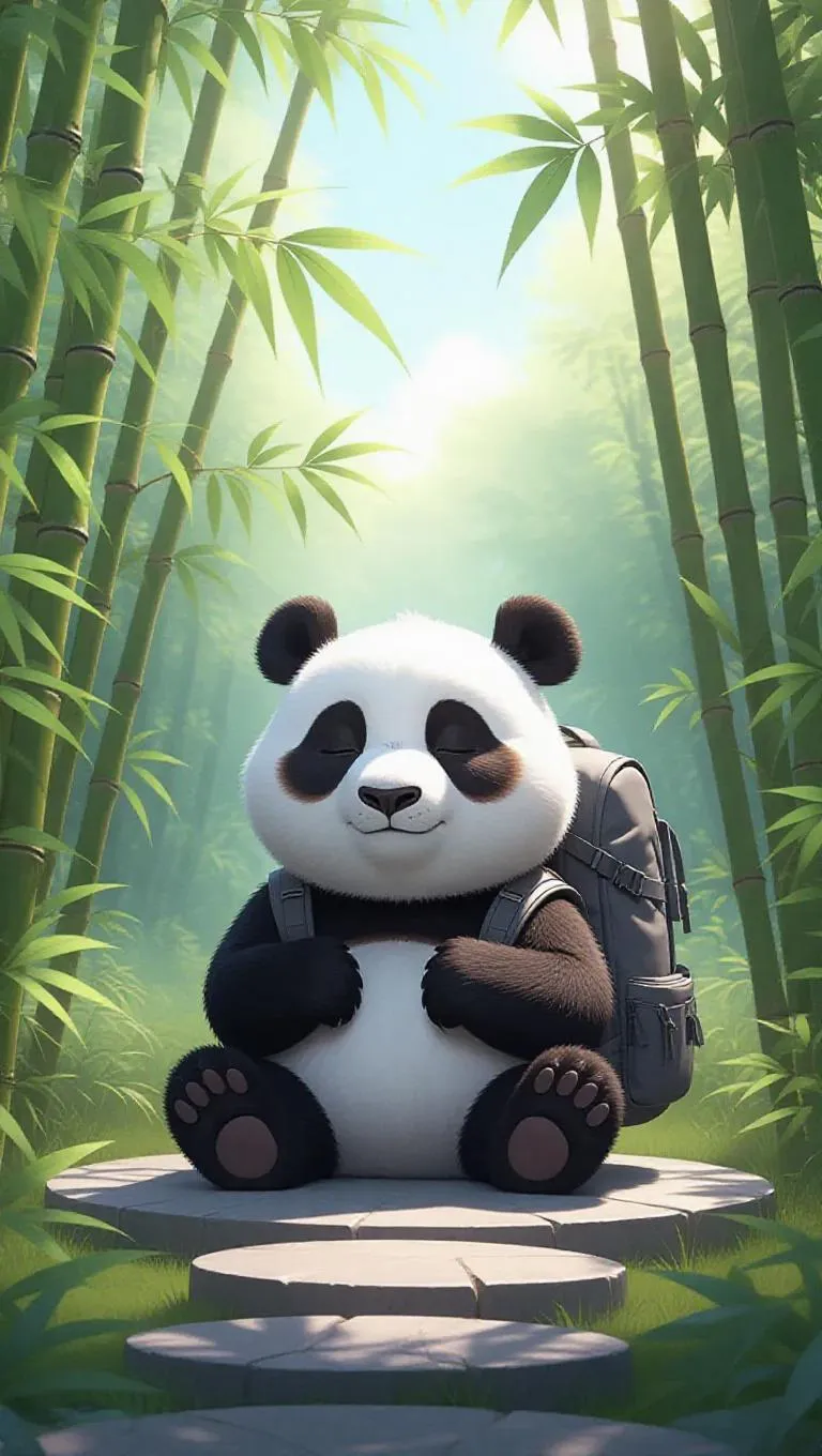 A cartoon panda meditates peacefully on a zen garden, holding a gray backpack. A bamboo forest sways gently in the breeze. The bamboo, tall and serene, symbolizes tranquility. The sky above is painted in tranquil greens, suggesting a calm afternoon, with soft sunlight filtering through the leaves.