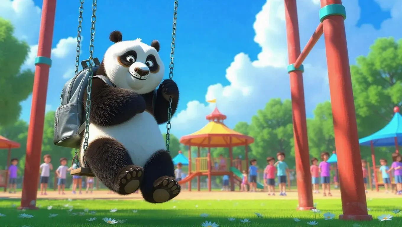 A cartoon panda sits thoughtfully on a park swing, holding a silver backpack. A playground bustling with children is in the background. The children, joyful and carefree, capture the essence of youth. The sky above is painted in bright cerulean, suggesting a vibrant day, with fluffy clouds floating by.