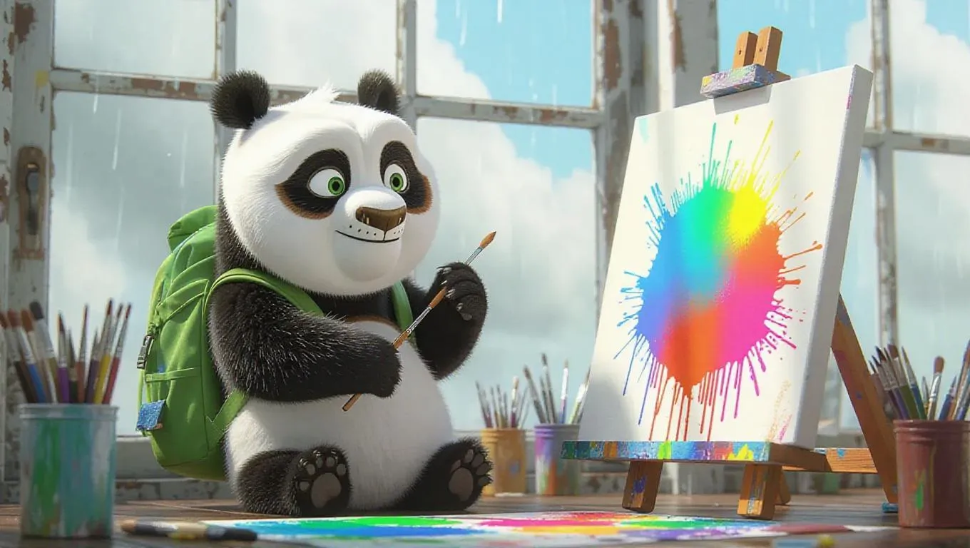 A cartoon panda sculpts creatively in an art studio, holding a chartreuse backpack. A canvas with bright splashes of color stands nearby. The paints, vibrant and lively, signify the beauty of creativity. The sky outside the window is painted in light greys, suggesting a cloudy but inspiring day, with raindrops tapping against the glass.