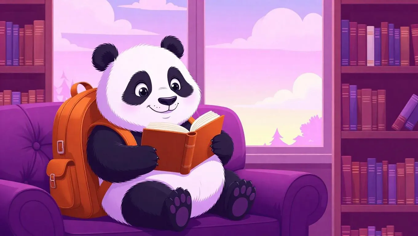 A cartoon panda reads happily on a comfortable couch, holding a rust-red backpack. A bookshelf filled with books stands in the background. The books, full of stories, represent adventure and knowledge. The sky outside the window is painted in soft lavender, suggesting a relaxing evening, with a soft glow.