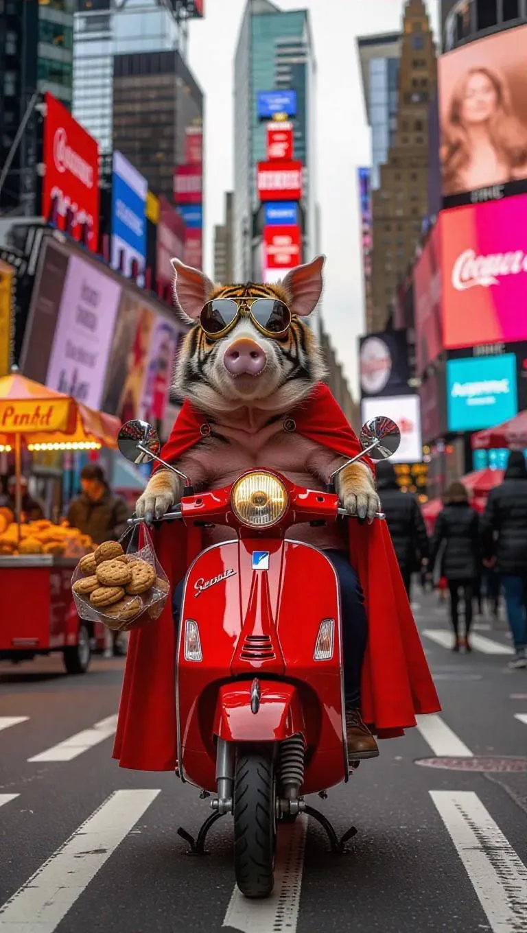 A fashionable pig poses confidently on a vintage scooter, gliding down a bustling city avenue. The tiger, wearing a bright red cape and aviator goggles, carries a bag of freshly baked cookies in its front paw. The avenue is alive with street performers and food carts. A towering skyscraper in the distance reflects the dazzling city lights, creating an energetic vibe.