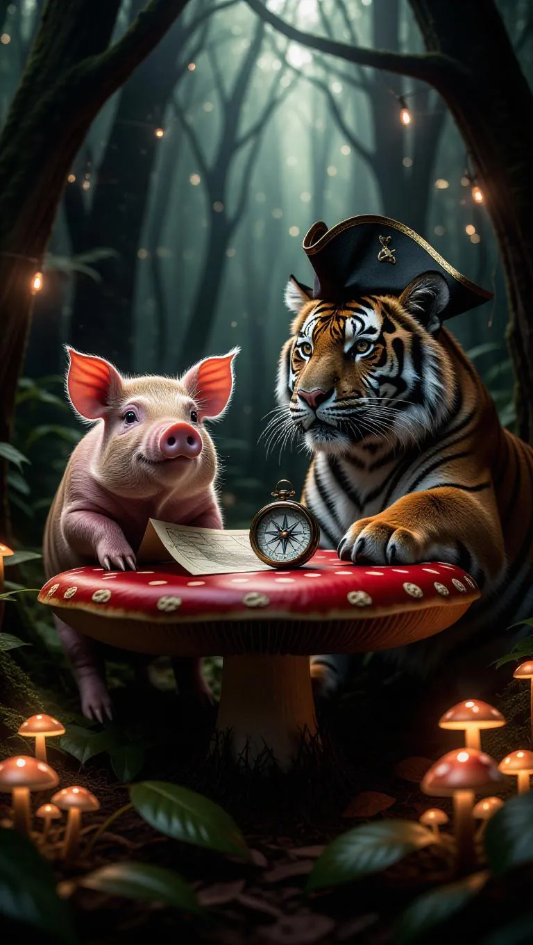 An inquisitive pig is examining a treasure map while seated atop a giant mushroom in an enchanted forest. The tiger, wearing a pirate hat and eye patch, holds a compass in its front paw. The forest is thick with mystical trees and glow-in-the-dark mushrooms. Fireflies flicker in the air, creating a magical and mysterious backdrop.
