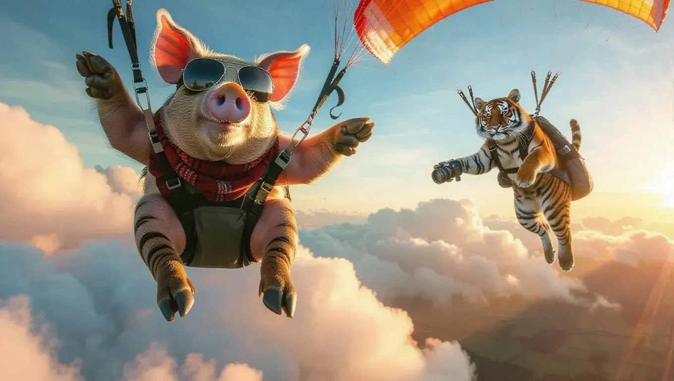 A daring pig is soaring through the air on a hang-glider, navigating the clouds. The tiger, wearing aviator sunglasses and a scarf, is harnessed to a parachute and holds a camera in its front paw. Above the clouds, a vibrant sunset bursts with colors. The thrill of adventure fills the atmosphere as they embrace the sky.