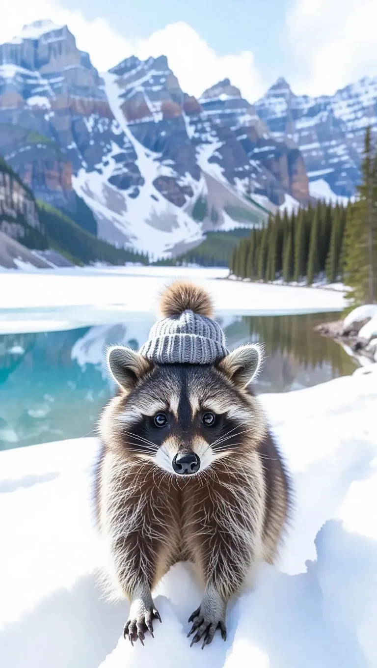 A curious raccoon wanders through the snowy landscapes of the Canadian Rockies, its fur blending with the white snow. The raccoon wears a thick fur coat and a knitted hat atop its head, its breath visible in the cold air. Behind it, towering mountains and glaciers rise up, their surfaces glistening in the sunlight. In the distance, a small lake reflects the blue sky, its waters calm and serene. The air is crisp and filled with the scent of pine trees.