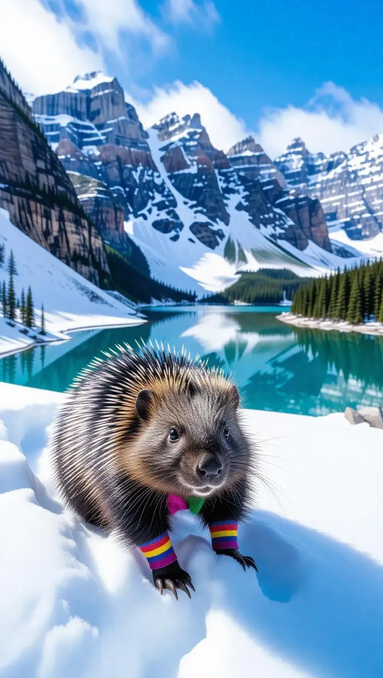A curious porcupine wanders through the snowy landscapes of the Canadian Rockies, its quills contrasting with the white snow. The porcupine wears a colorful scarf and boots, its breath visible in the cold air. Behind it, towering cliffs and icy formations rise up, their surfaces glistening in the sunlight. In the distance, a small pond reflects the blue sky, its waters sparkling. The air is crisp and filled with the scent of cedar trees.
