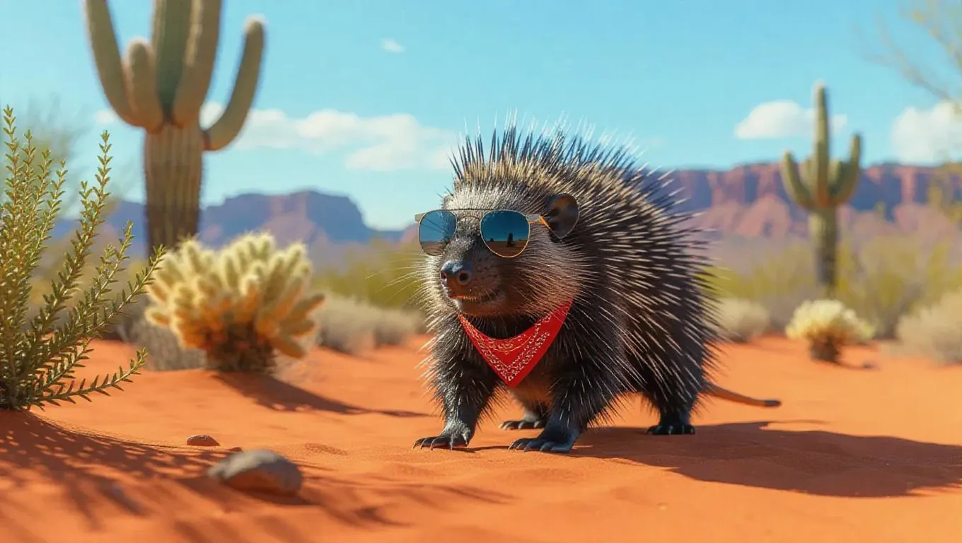 A curious porcupine wanders through the sandy deserts of the Southwest, its quills blending with the reddish ground. The porcupine wears a bandana and sunglasses, its breath visible in the hot air. Behind it, cacti stand tall against the blue sky, their shadows stretched long. In the distance, a mirage shimmers on the horizon. The air is warm and filled with the scent of sagebrush.