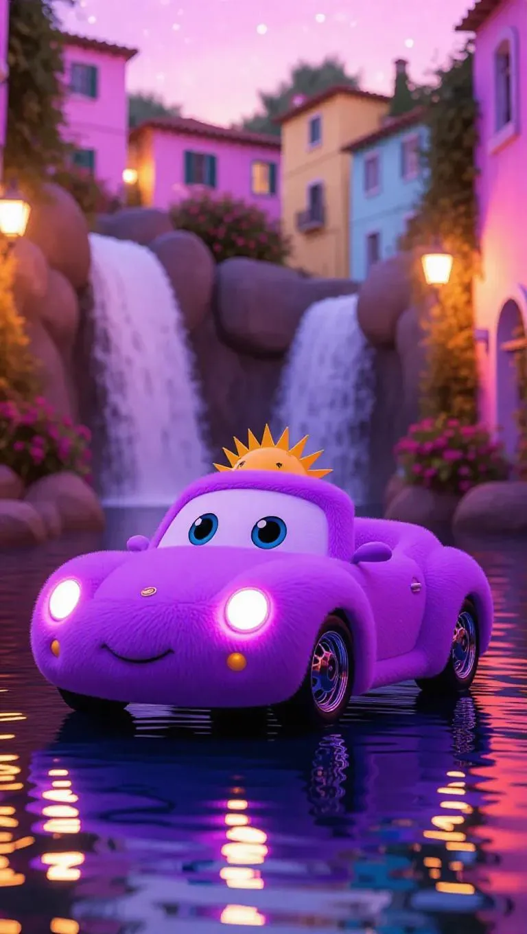 A dazzling, Jellycat-style convertible with soft, rounded edges and bright, joyful eyes is parked next to a splendid waterfall in a colorful, pastel-colored town. Its body is covered in plush, lavender fur, with white paws and a tiny, lovable sunroof on top. The vibrant afternoon sky above is filled with twinkling stars, with soft, warm sunlight filtering through, casting vivid shadows and emphasizing the car's soft texture. The scene reflects a magical, whimsical allure, suitable for a children's storybook.