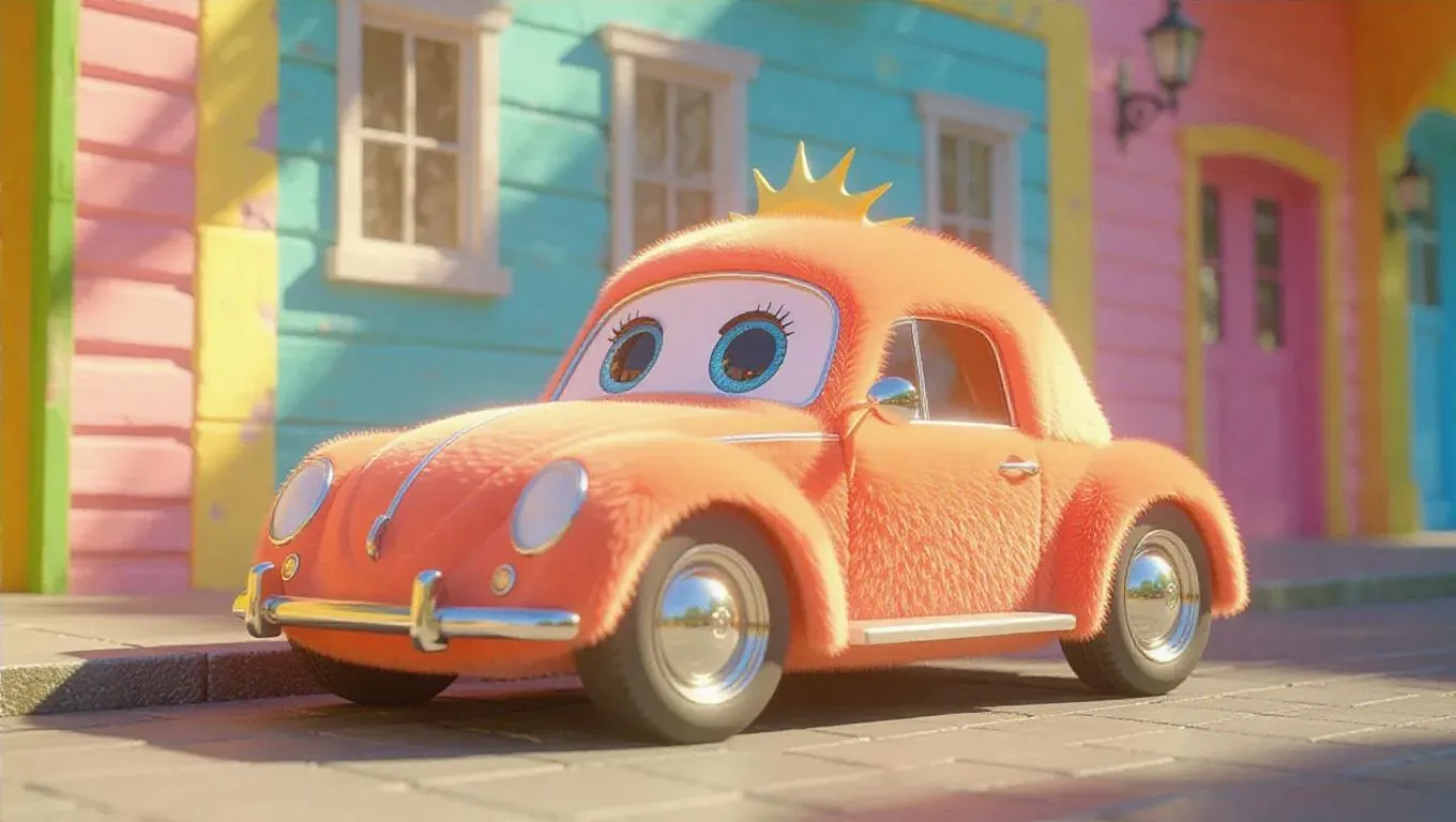 A charming, Jellycat-style convertible with soft, rounded edges and large, shining eyes is parked next to a colorful mural in a lively, pastel-colored neighborhood. Its body is covered in plush, peach fur, with white paws and a tiny, captivating sunroof on top. The sunny afternoon sky is vibrant and clear, and soft, warm sunlight filters through, casting inviting shadows and showcasing the car's cuddly texture. The scene radiates an artistic, lively spirit, suitable for a children's storybook.