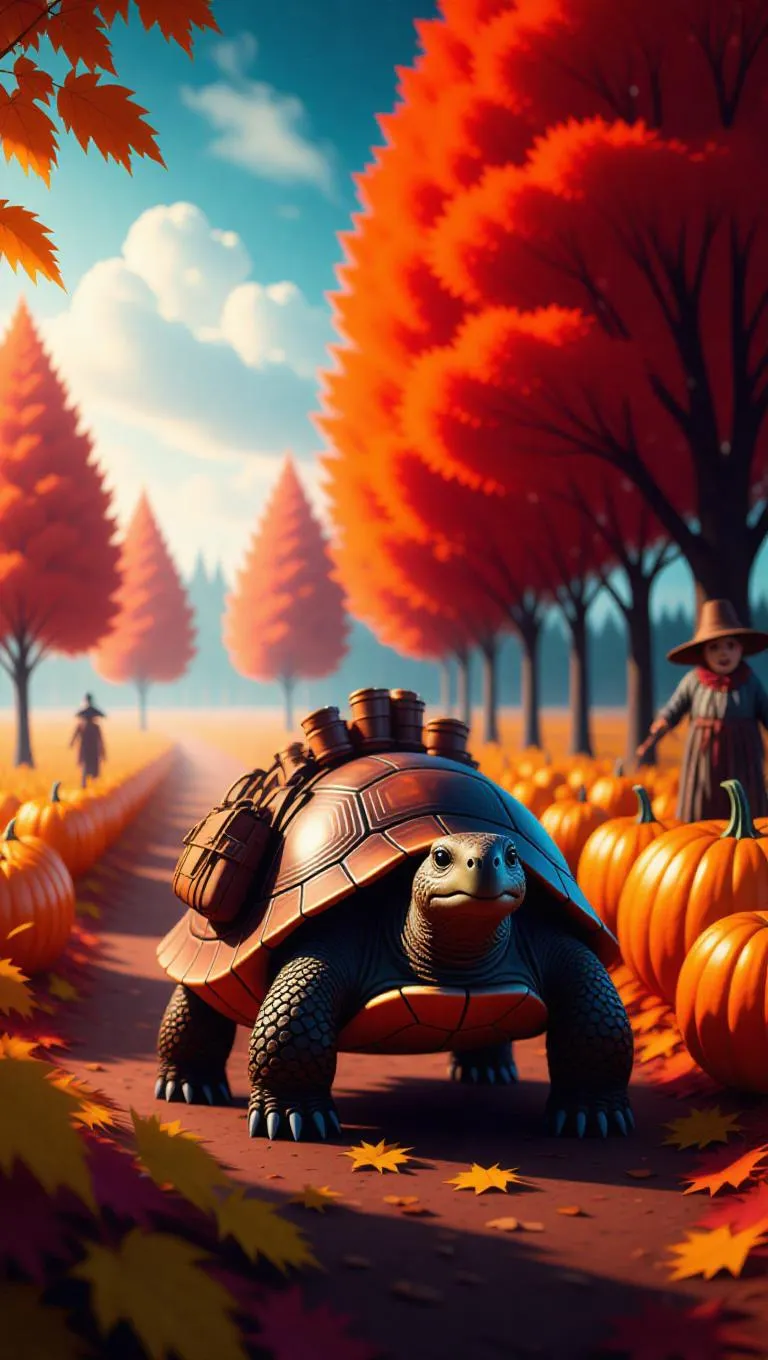 A fearless tortoise trudges through an autumn landscape, carrying a small backpack filled with supplies. The tortoise wears a knitted sweater and a scarf. Behind it, trees with fiery red and orange leaves line the path, their colors vibrant against the blue sky. In the distance, a pumpkin patch stretches out, with a scarecrow standing guard. The sky is a cool gray, with the sun peeking through clouds.