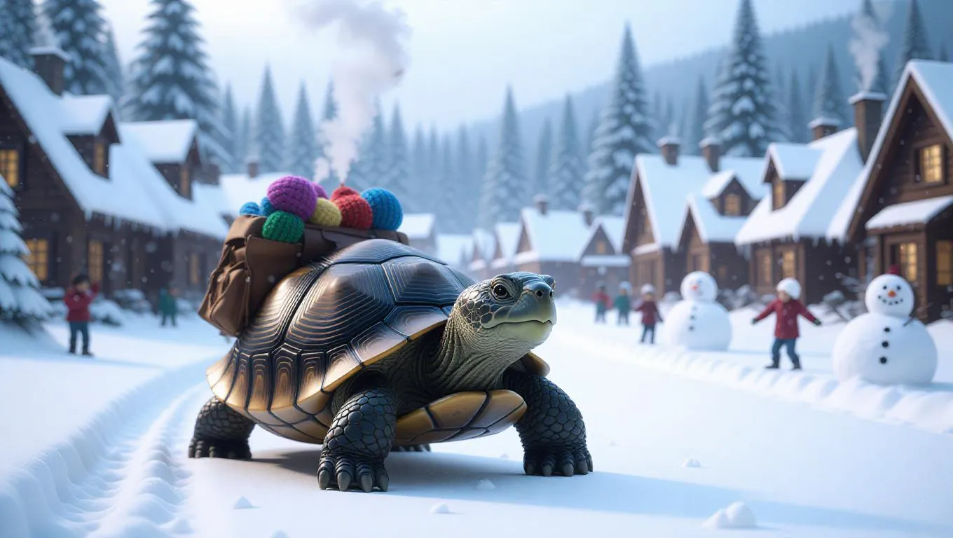 A diligent tortoise trudges through a snow-covered village, carrying a small backpack filled with supplies. The tortoise wears mittens and a parka. Behind it, quaint cottages with smoke rising from chimneys create a warm scene. In the distance, children build snowmen and engage in snowball fights. The sky is overcast gray, with flurries gently falling.