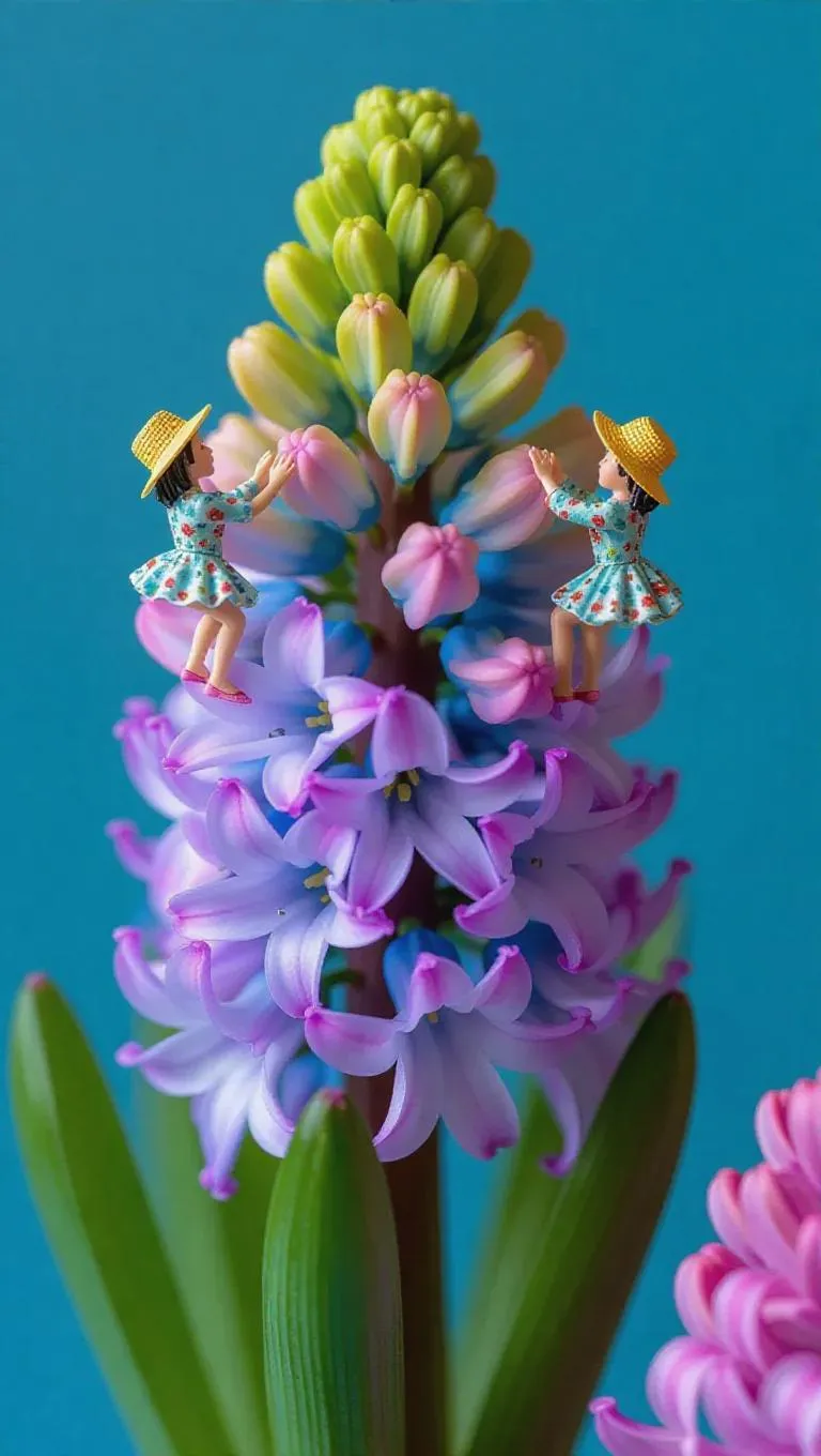 A few tiny figures, clad in vivid floral frocks and visors, perch on a radiant hyacinth, tenderly massaging its petals with tiny hands. The cascading petals and thick stems create a splendorous scene, capturing a moment of care and delight.