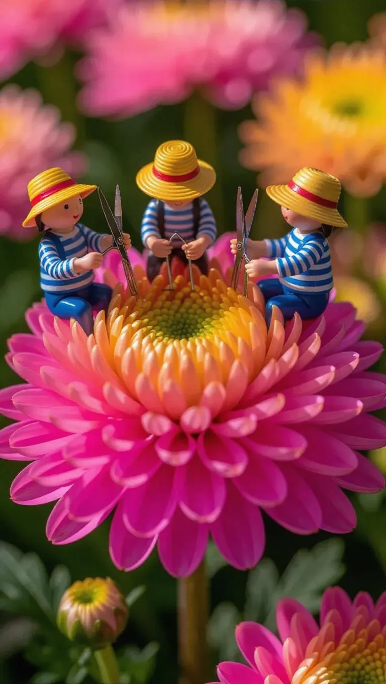 Several thumb-sized figures, sporting striped shirts and floppy hats, rest atop a colorful chrysanthemum, carefully refining its petals with tiny scissors. The lush petals and broad stems create a joyful ambience, capturing a moment of craftsmanship and fun.