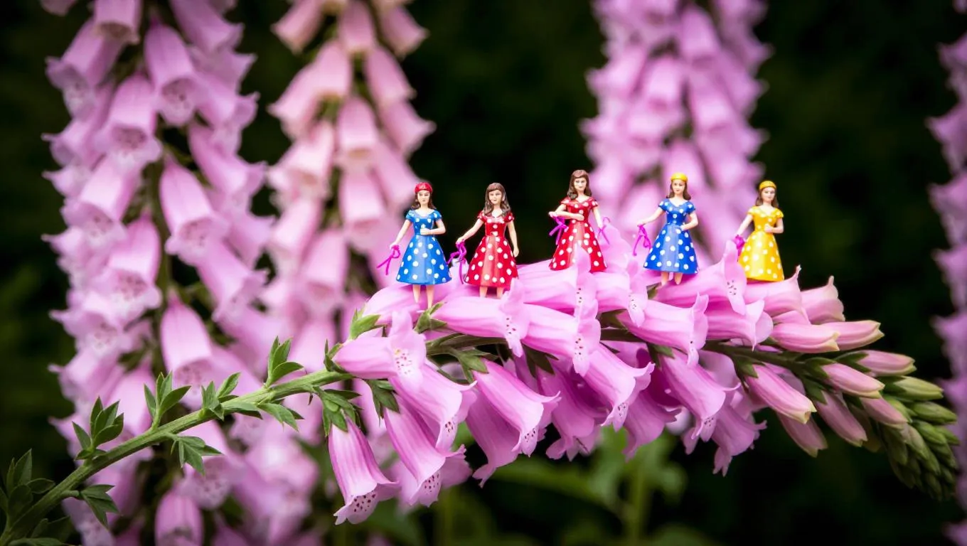 Several thumb-sized figures, dressed in radiant patterned dresses and sun caps, rest on a flowering foxglove, cautiously wrapping its stems with tiny ribbons. The decorative petals and spire-like stems create a delicate ambiance, capturing a moment of festivity and charm.